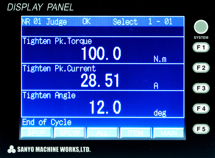 When tightening, Sanyo's patented control method measures and monitors angle and time to adjust motor speed automatically for multiple axes with differing torque angles. This ensures the tightening process is completed in the set amount of time.