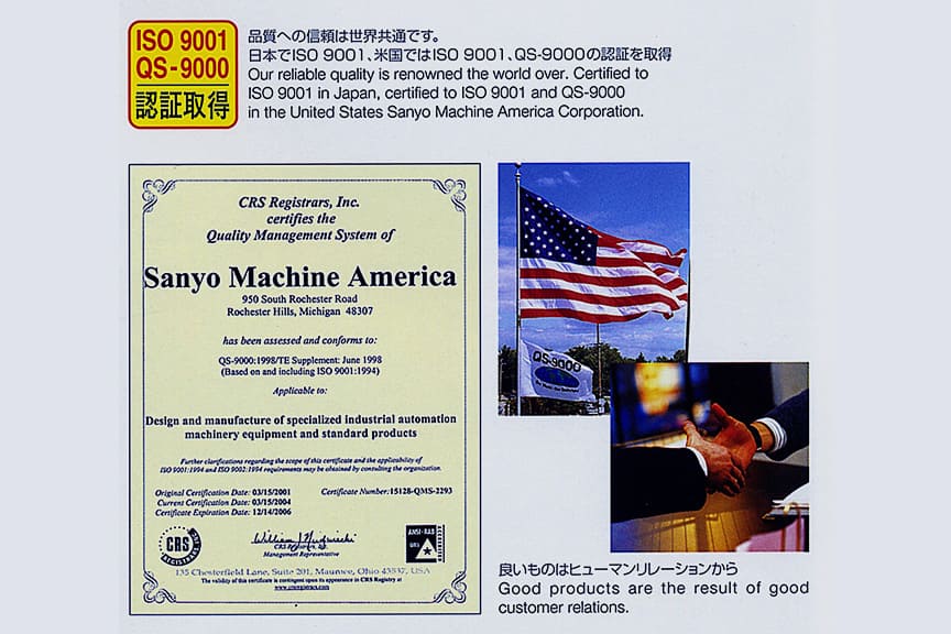 Feb. Sanyo Machine America Corp. certified to ISO 9001 and QS-9000 certification for its automatic operation facilities.