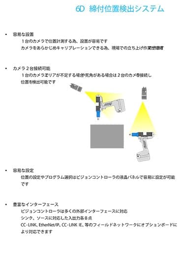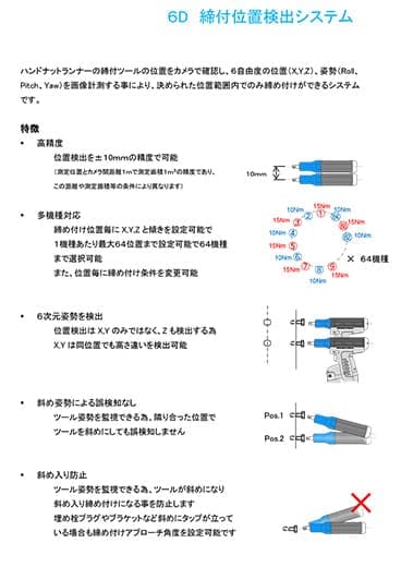 ハンドナットランナーの締め付けツールの位置をカメラで確認し、6自由度の位置(X,Y,Z)、姿勢(Roll、Pitch、Yaw)を画像計測する事により、決められた位置範囲内でのみ締め付けができるシステムです。SHDN型ハンドヘルドナットランナー、SHBN型ワイヤレスナットランナーに対応しています。